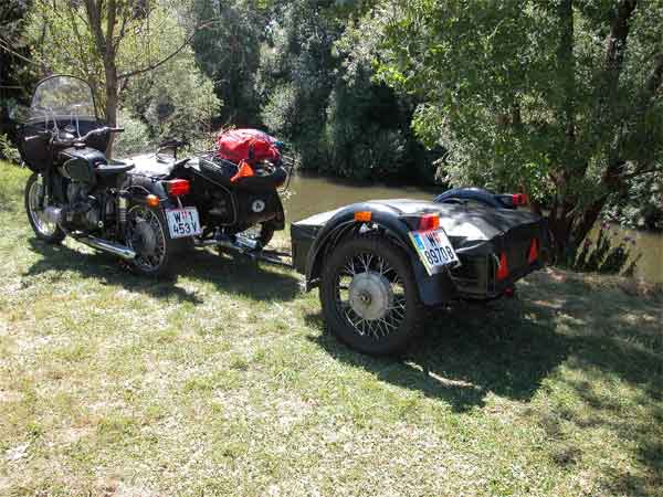 Es dürfte nicht allgemein bekannt sein, dass es von DNEPR auch einen original Anhänger gibt. Die Konstrukteure haben ´Restenverwertung´ betrieben und möglichst viele, vorhandende Gespannteile verwendet. Der Hänger hat eine asymetrische Deichsel und läuft in der Spur des Zugfahrzeugs, es werden auch die gleichen Räder verwendet, d.h. das Reserverad kann auch für den Hänger zum Einsatz kommen. Auch Kotflügel und Blinker/Rücklicht stammen vom Bike, es werden auch die gleichen Stoßdäpfer verwendet. Dadurch ergibt sich harmonischer Gesamteindruck, Das Gespann mit Hänger sieht einfach cool aus und fährt auch super - bergauf mit vollem Anhänger wirds allerdings etwas gemütlicher...Wer so wie wir gern komfortabel zeltet, wird den zusätzlichen Stauraum schätzen.