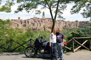 Mit dem Russen am Hänger fuhren wir in die Südtoskana, Provinz Grosseto. Von unserem Zeltplatz bei Albenia aus unternahmen wir schöne Ausfahrten mit dem Russen: nach Pittigliano, einer mittelalterlichen Stadt auf einem Tuffkegel; zur Therme Saturnia, wo man frei im warmen Schwefelwasser baden kann; nach San Giminiano, dem ´Manhattan´ des Mittelalters; in Porto Santo Stefano starteten wir die Umrundung der Halbinsel nach Porto Ercole; wir waren in Sorano einer Stadt auf Tuffstein, ähnlich wie Pittigliano; schöießlich sahen wir noch St. Galgano, eine Kathedrale, deren Dach vor hunderten Jahren wegen Geldmangels verkauft worden war...Die sanften Berge mit ihren kurvigen Strassen sind wie geschaffen für gemütliche Russenausfahrten!